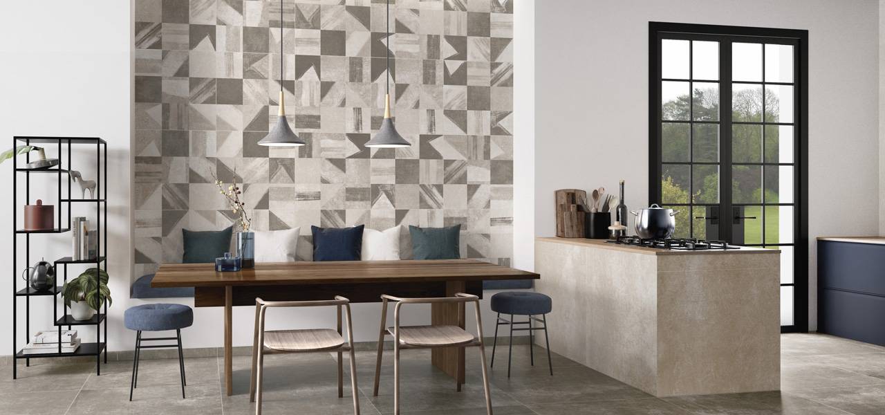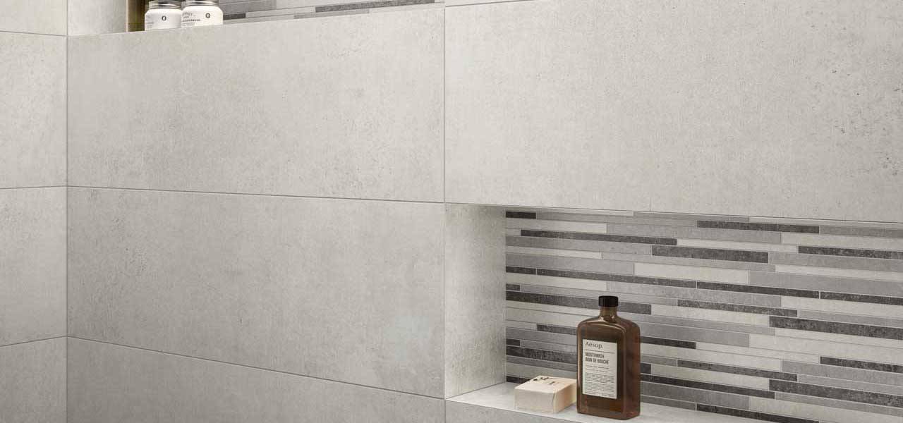 Atbilstošās keramikas sienas flīzes detalizēti un atturīgi interpretē grīdas flīžu pēdas, divos gaišos toņos ar glūdu virsmu.