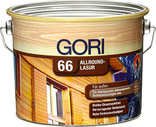 Pirmreizējā apstrāde: neapstrādāta, zilgana koksne: vienu reizi apstrādāt ar gruntseļļu. 2 – 3 x GORI 66 ALLROUND LASUR. Cita koksne: 2 – 3 x GORI 66 ALLROUND LASUR. Atjaunošana: 1 – 2 x GORI 66 ALLROUND LASUR.