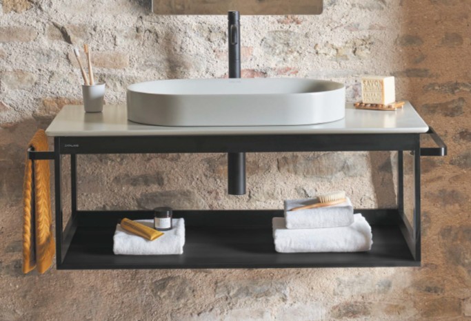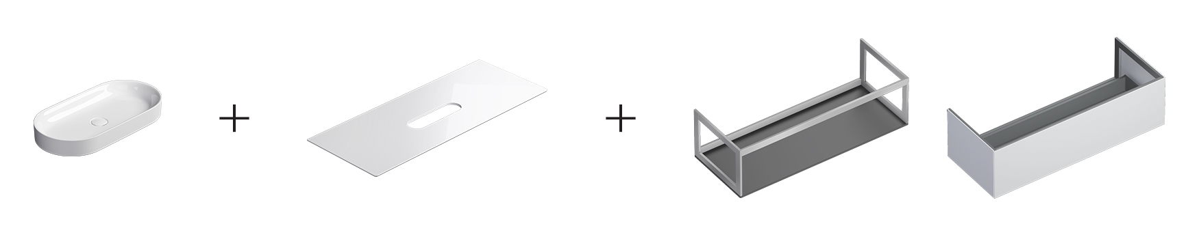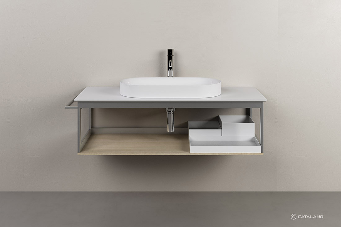 Komplekta cenā ietilpst alumīnija rāmis, divi dvieļu turētāji sānos, keramikas virsma un izlietne.