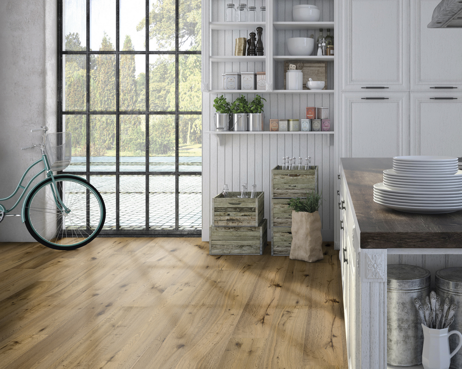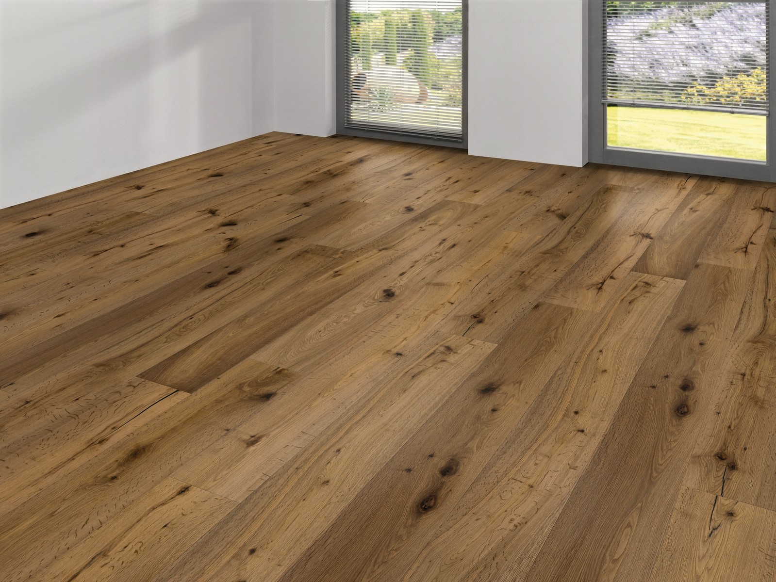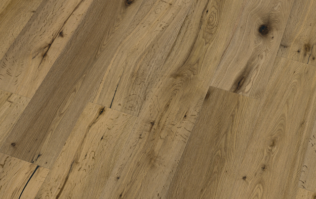 Trīsslāņu parkets, dēlis, eļļots, gropes visās malās, brašēta struktūra, tvaicēts, piemērots apsildāmām grīdām.
